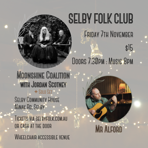 ~ And rounding out your night of aural pleasure is Moonshine Coalition [with Jordan Scotney]: An intoxicating fusion of Americana and Australian Frontier Music.